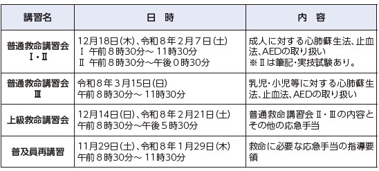 申込み:各開催日の前月20日午前9時から4日前までに市ホームページまたは電話で消防署