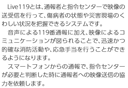 災害現場の映像を撮影することが、SNS等への投稿と誤解される場合があります。そのような場合には、消防に映像で通報していることを、周囲の人にはっきりと伝えてください。