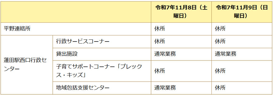 電気設備点検のため、令和7年11月8日(土曜日)・9日(日曜日)は、平野連絡所と蓮田駅西口行政センターの一部が臨時休所します。当日は、住民票・印鑑登録証明書等の交付、住所異動はできません。