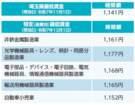 12月1日(月)から5業種の埼玉県特定(産業別)最低賃金の時間額が改正されます。