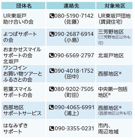 ちょっとした時間を使って地域に貢献したいという方のために支える側として活動する団体があります。掃除、買い物等の家事や、見守り、話し相手、通院の付き添い等、日常生活に困りごとがある方へ、訪問型サポートをする団体です。活動に興味のある方は各団体にお問合せください。