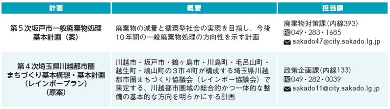計画案・応募用紙・応募箱設置場所:担当課、市政情報コーナー、各出張所・地域交流センター、中央図書館、市ホームページ(第5次坂戸市一般廃棄物処理基本計画は、西清掃センター、東清掃センター、環境学館いずみにも設置)