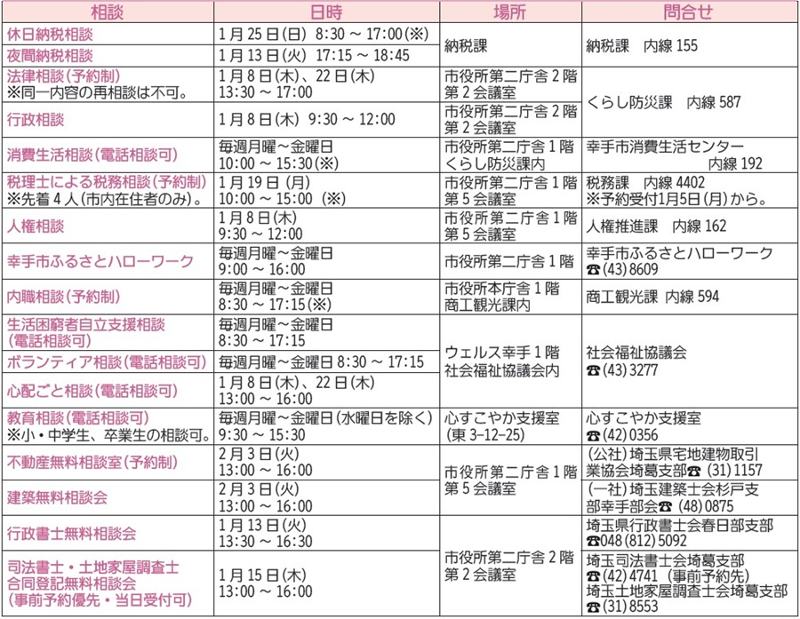 くらし 各種相談 29/38 前の記事 次の記事 発行日 : 2026年01月04日 自治体名 : 埼玉県幸手市 広報紙名 : 広報さって 2026年(令和8年)1月号 (※)12:00~13:00を除く。 Tweet シェアする 今月の日曜開庁 市長コラム