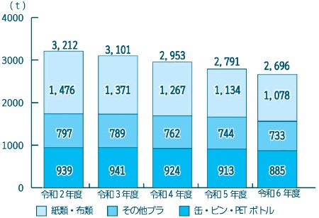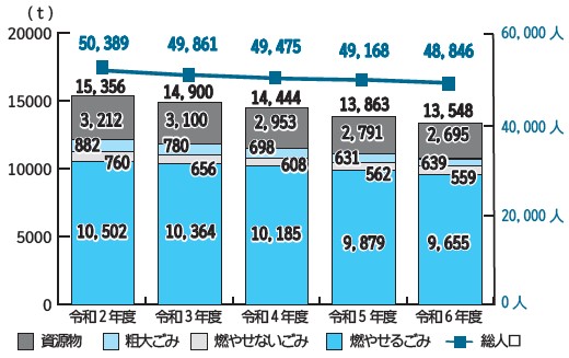 総ごみ収集量の推移をみますと、令和2年度は、新型コロナウイルスの影響に伴う外出自粛などによって増加しましたが、令和2年度をピークとして令和3年度からは減少傾向に転じており、令和6年度も前年度から減少しました。