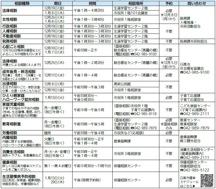 ※各相談(かくそうだん)の詳細(しょうさい)な内容(ないよう)は、市(し)ホームページまたは各公共施設(かくこうきょうしせつ)に置(お)いてある「日高市(ひだかし)[市民相談(しみんそうだん)]のご案内(あんない)」をご覧(らん)ください。