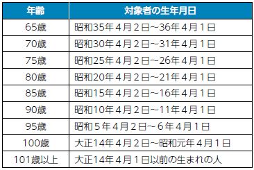 ※令和7年度から11年度までの5年間については、経過措置期間となり、年度中に、70・75・80・85・90・100歳になる人も対象です。