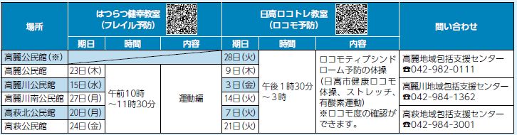 講座 10月の地域包括支援センターの教室 26/38 前の記事 次の記事 発行日 : 2025年09月01日 自治体名 : 埼玉県日高市 広報紙名 : 広報ひだか 令和7年9月号 ※武蔵台公民館の改修工事に伴い、はつらつ健幸教室は中止となります。日高ロコトレ教室は、高麗公民館で実施します。 ■共通事項 対象:65歳以上の市民 費用・申し込み:無料・不要 Tweet シェアする ひだかインフォメーションーイベント(2)ー 公民館イベント