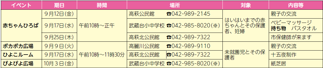※9月の赤ちゃんひろば(武蔵台公民館)と10月のぴよぴよ広場(武蔵台公民館)は武蔵台小中学校3階多目的室で行います。スリッパと靴を入れる袋をお持ちください。