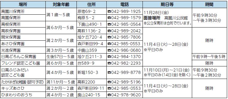 ・高根保育所は令和9年度に高麗川保育所に移転統合します。そのため、令和8年度の新規3歳児、4歳児の募集は停止します。