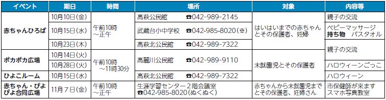 ※10月の赤ちゃんひろば(武蔵台公民館)は武蔵台小中学校3階多目的室で行います。スリッパと靴を入れる袋をお持ちください。