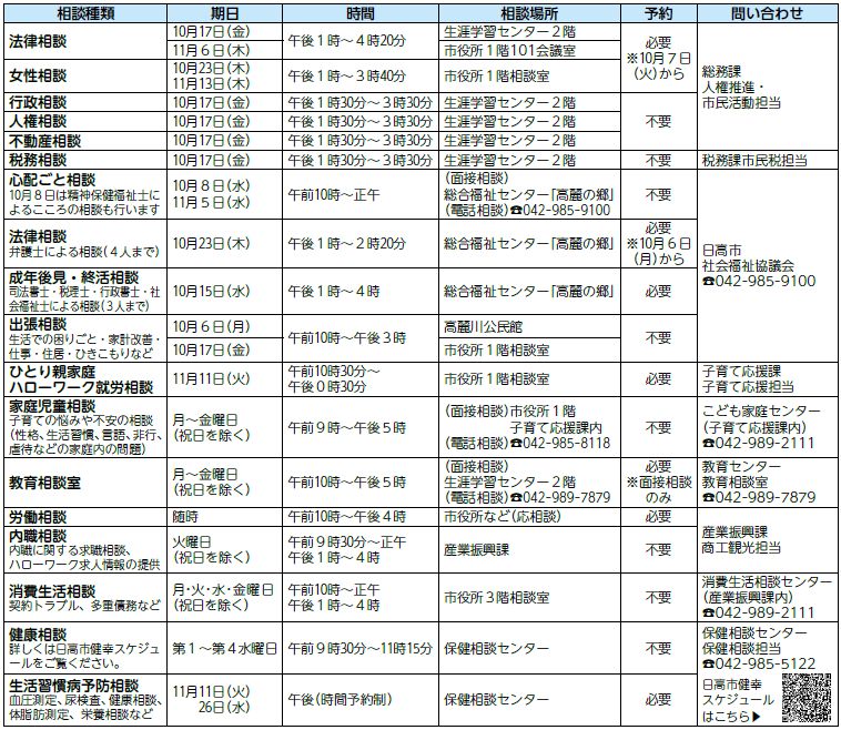 ※各相談(かくそうだん)の詳細(しょうさい)な内容(ないよう)は、市(し)ホームページまたは各公共施設(かくこうきょうしせつ)に置(お)いてある「日高市(ひだかし)[市民相談(しみんそうだん)]のご案内(あんない)」をご覧(らん)ください。