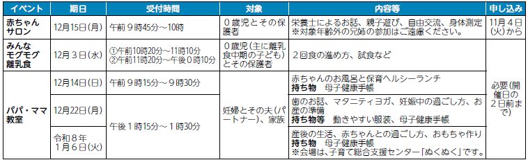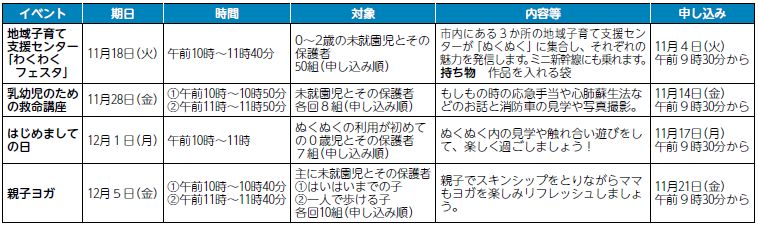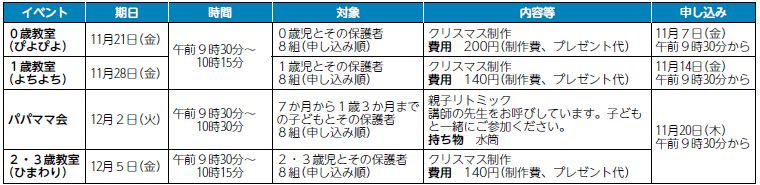 ※ひよこルームは12月17日(水)にクリスマス会を行います。利用予約は11月20日(木)午前9時30分以降に、子育て総合支援センター「ぬくぬく」へ