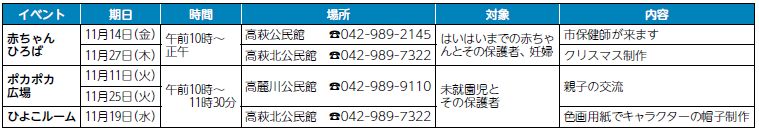 ※11月の赤ちゃんひろば(武蔵台公民館)と12月のぴよぴよ広場(武蔵台公民館)はお休みします。