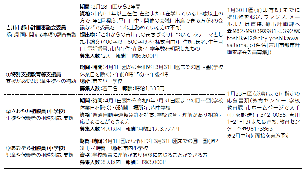 しごと くらしの情報【募集】(1) 12/31 前の記事 次の記事 発行日 : 2026年01月01日 自治体名 : 埼玉県吉川市 広報紙名 : 広報よしかわ 2026年1月号 No.840 ○費用の記載がないものは、すべて無料です。 ○郵送先は特に記載がない場合、〒342-8501(住所不要)です。 ■職員・委員など(外部機関含む) Tweet シェアする 今月のPick Up Contents くらしの情報【募集】(2)