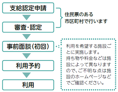 利用には、初めに居住市区町村へ支給認定の申請を行い、認定を受ける必要があります。
