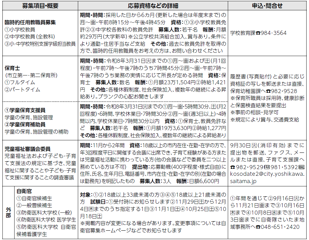 くらし くらしの情報【募集】 9/29 前の記事 次の記事 発行日 : 2025年09月01日 自治体名 : 埼玉県吉川市 広報紙名 : 広報よしかわ 2025年9月号 No.836 ○費用の記載がないものは、すべて無料です。 ○郵送先は特に記載がない場合、〒342-8501(住所不要)です。 ■職員・委員など(外部機関含む) Tweet シェアする 市長コラム「価値ある未来を、共に」 くらしの情報【お知らせ】(1)