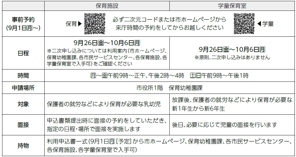 令和8年4月からの市内各保育施設と学童保育室の利用を希望する方の申し込みを受け付けます。混雑緩和のため、事前予約が必要となります。スムーズな受け付けのため不明な点や相談は、事前に保育幼稚園課へお問い合わせください。