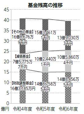 基金は、家計に例えると貯金です。基金には、災害時や財源が不足する場合に備えて貯めておく財政調整基金や、市債の返済に備えて貯めておく減債基金、特定の目的のために貯めておく公共施設整備基金などがあります。