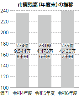 市債は、家計に例えると借金です。過去に借り入れた市債を約20億4497万8千円返済した一方、総合体育館長寿命化などの事業のために28億4454万9千円借り入れしたことにより、市債残高は増となりました。