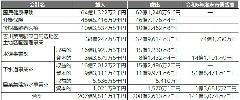 特別会計には、皆さまの健康保持に欠かせない国民健康保険、介護保険および後期高齢者医療の他、快適に暮らすことができるまちづくりを進めるための下水道事業や農業集落排水事業、吉川美南駅東口周辺地区の開発を行うための吉川美南駅東口周辺地区土地区画整理事業があります。また、日々の生活には欠かすことのできない水道事業があります。