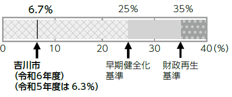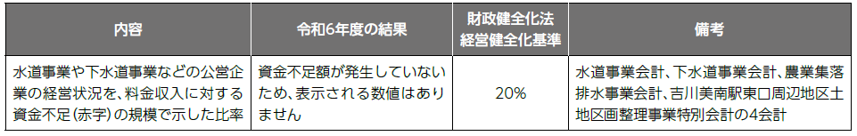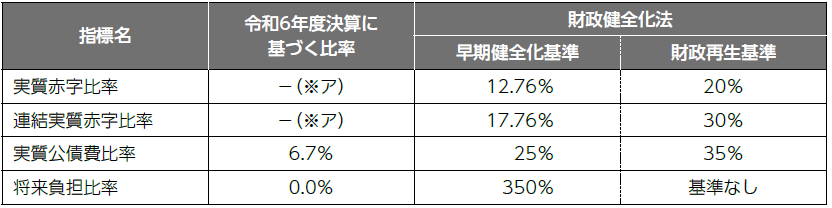 令和6年度決算から算出した健全化判断比率および公営企業の経営健全度を示す資金不足比率は、いずれも基準以下の水準を保っています。