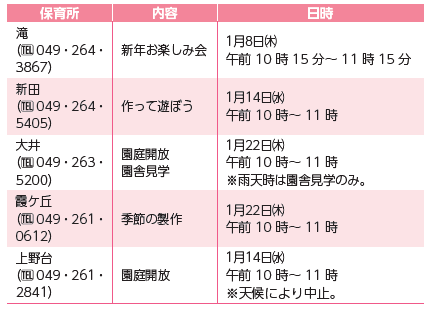 子育て 市立保育所地域交流事業(申込不要) 9/52 前の記事 次の記事 発行日 : 2026年01月01日 自治体名 : 埼玉県ふじみ野市 広報紙名 : 市報ふじみ野 令和8年1月号 対象:就学前の子と親(新田保育所のみ1歳以上の就学前の子と親) 持ち物:飲み物、着替え ※検温をしてからお越しください。 ※車での来所はご遠慮ください。 Tweet シェアする 子育て支援センター2月の自由利用(申込不要・室内のみの開放) 親子日帰りバスツアー