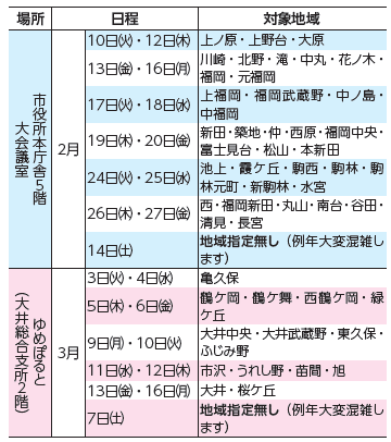 申告期間中は多くの人が来場するため、大変混雑します。e-Tax(国税電子申告)による確定申告や、郵送申告をご検討ください。混雑を緩和するため、地域ごとに日程を設定して申告相談を受け付けます。当日は整理券を配布していますので、受付で整理券を受け取ってから会場にお越しください。事前予約も受け付けていますので、ご利用ください。詳しくは、市ホームページをご覧ください。