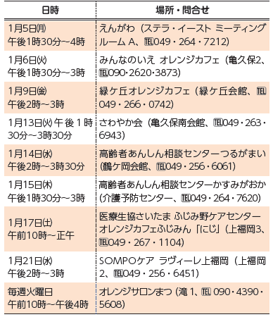 くらし オレンジカフェ 36/52 前の記事 次の記事 発行日 : 2026年01月01日 自治体名 : 埼玉県ふじみ野市 広報紙名 : 市報ふじみ野 令和8年1月号 認知症の人と家族、地域住民、専門職が集う場です。 費用:申し込み時に確認 申込方法:電話で申し込む Tweet シェアする 広げよう!笑顔あふれる地域の輪 市民活動展示会・交流会2026 高齢者あんしん相談センターの家族介護教室・家族交流会