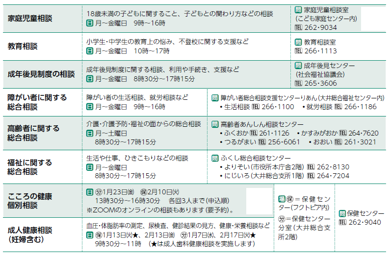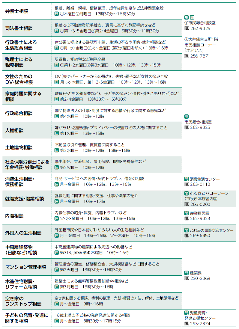 くらし 各種相談 45/52 前の記事 次の記事 発行日 : 2026年01月01日 自治体名 : 埼玉県ふじみ野市 広報紙名 : 市報ふじみ野 令和8年1月号 ※予約が必要な相談もありますので、事前に担当課へお電話ください。 Tweet シェアする みんなのひろば~イベント 救急メモ