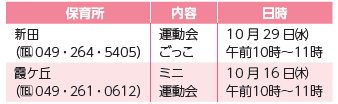 子育て 市立保育所地域交流事業(申込不要・雨天中止) 7/54 前の記事 次の記事 発行日 : 2025年10月01日 自治体名 : 埼玉県ふじみ野市 広報紙名 : 市報ふじみ野 令和7年10月号 対象:就学前の子と親(新田保育所は1歳以上の就学前の子と親) 持ち物:飲み物、タオル、着替え ※車での来所はご遠慮ください。 Tweet シェアする 出前子育てサロン 東児童センターバンビルーム・西児童センターかめさんルーム