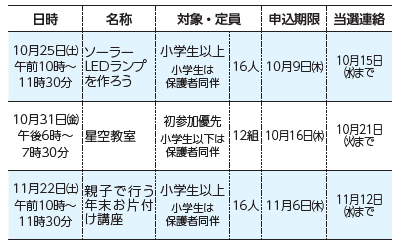 講座 「見て」「さわって」「感じる」体験の場「えこらぼ」環境学習講座 34/54 前の記事 次の記事 発行日 : 2025年10月01日 自治体名 : 埼玉県ふじみ野市 広報紙名 : 市報ふじみ野 令和7年10月号 場所:ふじみ野市・三芳町環境センター 申込方法:電話かウェブフォームで申し込む(抽選) ※当選者のみにエコパ(星空教室は環境課)から連絡。 申込み:環境課 (【電話】049・262・9022) Tweet シェアする 情報アクセス~イベント(5) シティプロモーション特設サイトの名前が決定