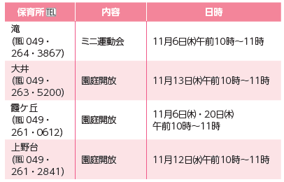 子育て 市立保育所 地域交流事業(申込不要) 15/58 前の記事 次の記事 発行日 : 2025年11月01日 自治体名 : 埼玉県ふじみ野市 広報紙名 : 市報ふじみ野 令和7年11月号 対象:就学前の子と親(人数制限なし) 持ち物:飲み物、タオル、着替え ※検温をしてからお越しください。 ※車での来所はご遠慮ください。 ※雨天の場合は中止です。 Tweet シェアする ご存じですか?病児・病後児緊急サポート事業 放課後児童クラブ冬休み一時保育