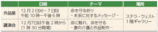 作品展では、深く重厚な「命」の表現を間近で鑑賞でき、講演会では、作品に込められた制作秘話や、妻との日々を通して見つめる「命」についての講演です。詳しくは、市ホームページをご覧ください。
