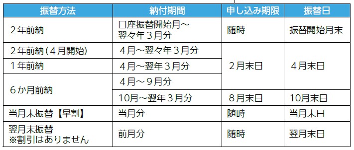 口座振替及びクレジットカード払いの1年前納、2年前納(4月開始)及び上半期(4~9月)の前納は、2月末日までにお申し込みください。