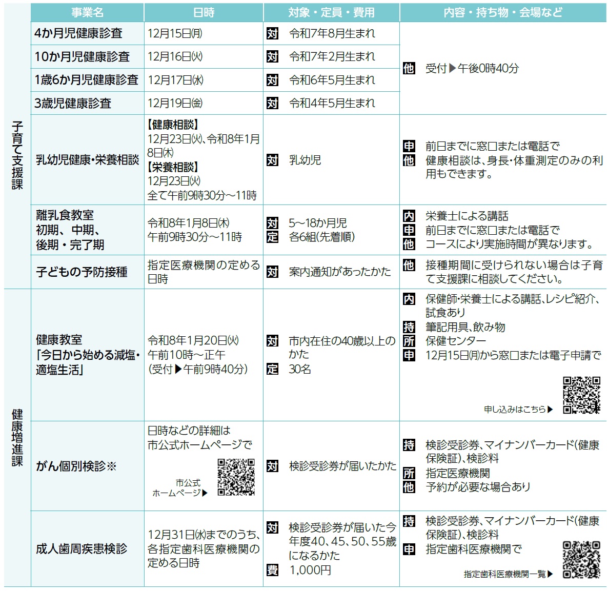 ※乳幼児健康診査、健康・栄養相談の二次元コードは本紙17ページをご覧ください。