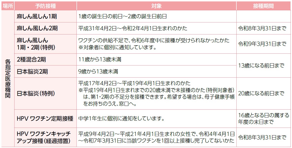 その他:接種期間に受けられない場合は子育て支援課に相談してください。