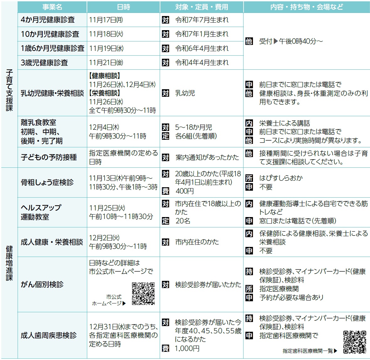 ※乳幼児健康診査、健康・栄養相談の二次元コードは本紙15ページをご覧ください。