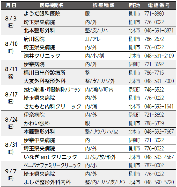 ※広報掲載後、当番医に変更が生じる場合があります。各新聞の埼玉版休日当番医欄も参照のうえ、お出かけください。