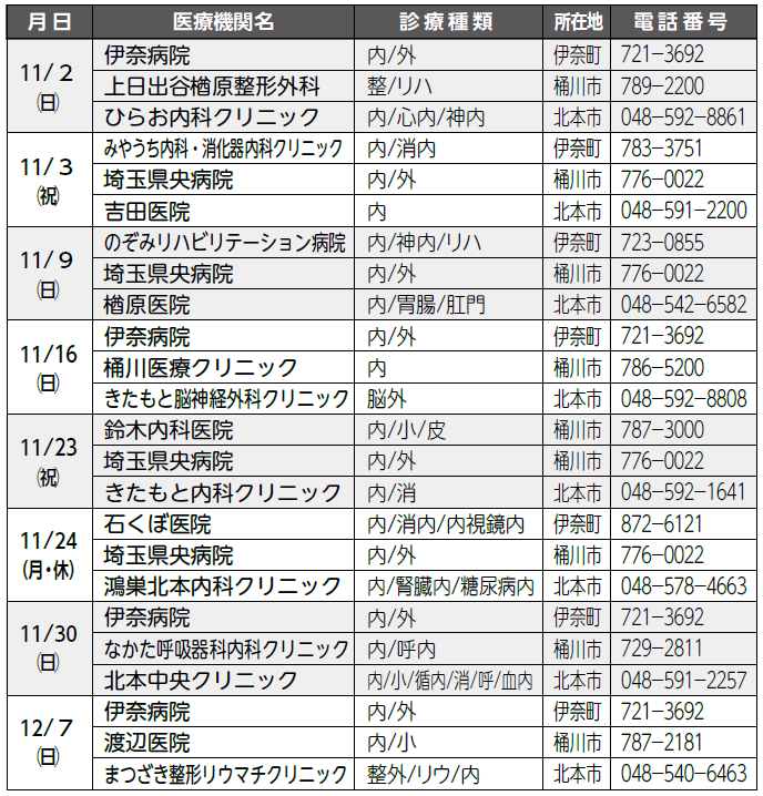 ※広報掲載後、当番医に変更が生じる場合があります。各新聞の埼玉版休日当番医欄も参照のうえ、お出かけください。