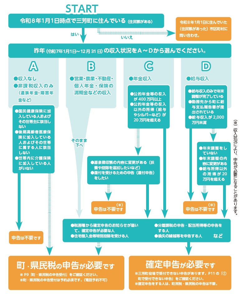 下記のフロー図は一般的な例です。これに当てはまらない場合や記載がない事例など、申告が必要か判断に困ったときは川越税務署(【電話】235-9411)か下記へお問い合わせください。