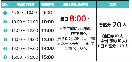 ・会場内に十分な待機スペースがないため、区分(2)以降の人は当日券を取得後、一度ご自宅への帰宅・お車での待機等にご協力ください。