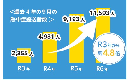昨年5月~9月の全国における熱中症による救急搬送人員の累計は97,578人でした。昨年は非常に厳しい暑さが長期間にわたって続き、9月に絞ると過去最多の搬送人員となりました。
