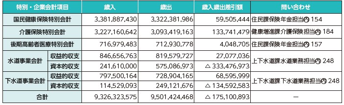 特定の事業を行うために一般会計と分けて設置される特別会計には、国民健康保険、介護保険、後期高齢者医療の各会計があり、他に企業会計として水道事業と下水道事業があります。各会計の決算概要は次のとおりです。