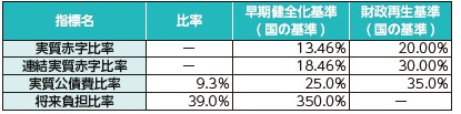 ※実質赤字、連結実質赤字及び資金不足比率は、黒字のため「-(該当なし)」の表示をしています。