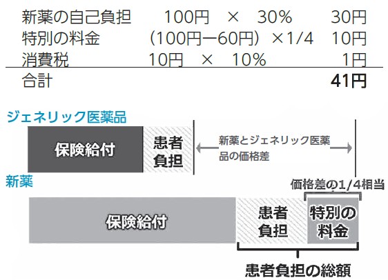 新薬の価格が1錠100円、ジェネリック医薬品の価格が1錠60円の場合、差額40円の4分の1である10円(税抜)を、通常の患者負担とは別に負担します。