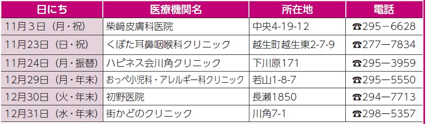※埼玉医科大学病院(毛呂本郷38)【電話】276-1465では、救急部が曜日・祝日を問わず救急患者を受け入れています。