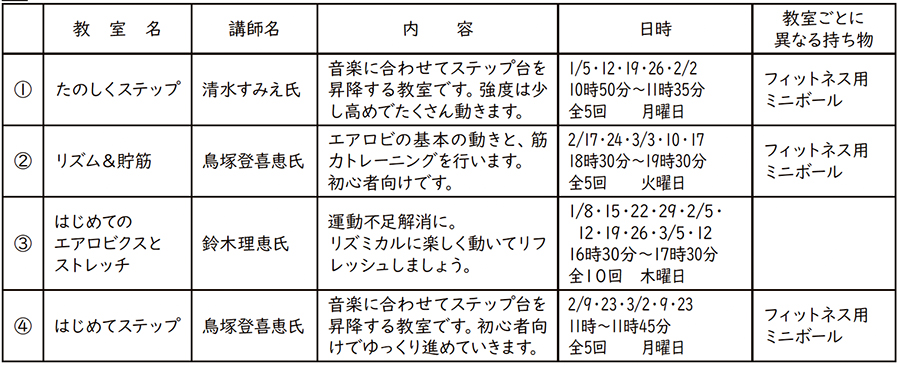 費用:(1)(2)(4)1教室500円(全5回) (3)1教室1,000円(全10回)