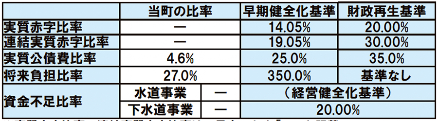 令和6年度決算についての町の健全化判断比率及び資金不足比率は表のとおりです。「地方公共団体の財政健全化に関する法律」に基づく健全化判断比率等全ての比率が基準を下回る結果となり、財政状況は前年度に引き続き健全段階であるという結果となっています。