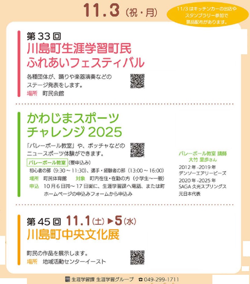 イベント 見る・遊ぶ・食べる!を川島町で 文化・スポーツ・グルメが大集合!秋のわくわく祭り 30/33 前の記事 次の記事 発行日 : 2025年10月01日 自治体名 : 埼玉県川島町 広報紙名 : 広報かわじま 2025年10月号 Vol.786 Tweet シェアする 窃盗被害が増えています 自転車を守るための防犯対策を! 町民カメラマンが撮影 川島町のその瞬間(とき)