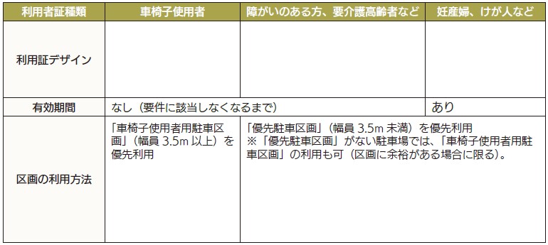 この制度は、歩行が困難な方などのための駐車区画について、対象者に利用証を交付することで、区画の適正利用を推進する制度です。障がいのある方や要介護高齢者、妊産婦の方などが対象です。